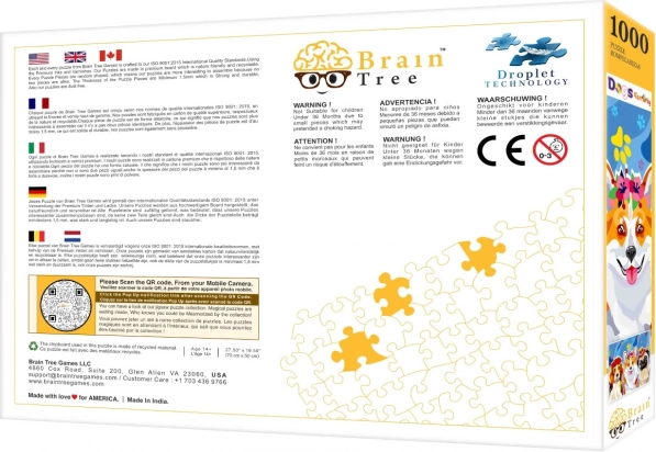 Geniet van uren puzzelplezier met de kwaliteits‑puzzel van Brain Tree uit de collectie Dogs Family met 1000 stukjes. De stukjes zijn willekeurig gesneden met unieke vormen, hebben een matte afwerking voor perfecte zichtbaarheid van details en een slijtvaste bedrukking. In de verpakking vind je ook een poster, sorteervakjes, een dekselstandaard en een hersluitbaar zakje voor de stukjes.