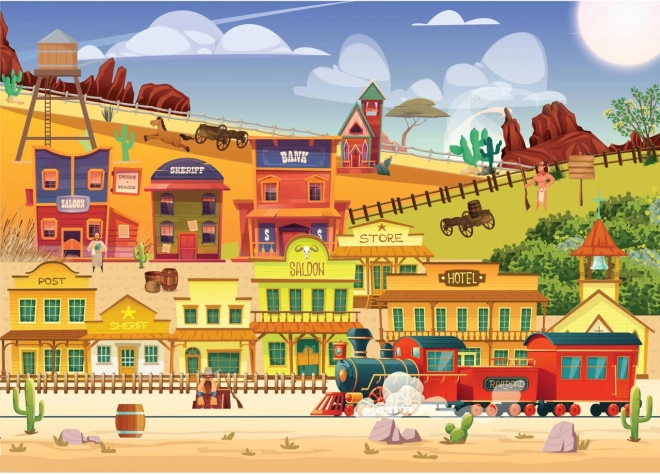 Ontdek de premium puzzel met een thema van een westernstadje en een stoomtrein van BRAIN TREE. Geniet van een matte afwerking voor perfecte zichtbaarheid van details, precies uitgesneden stukjes in willekeurige vormen en rijke accessoires, inclusief een poster, sorteervakjes, dekselstandaard en een hersluitbaar zakje.