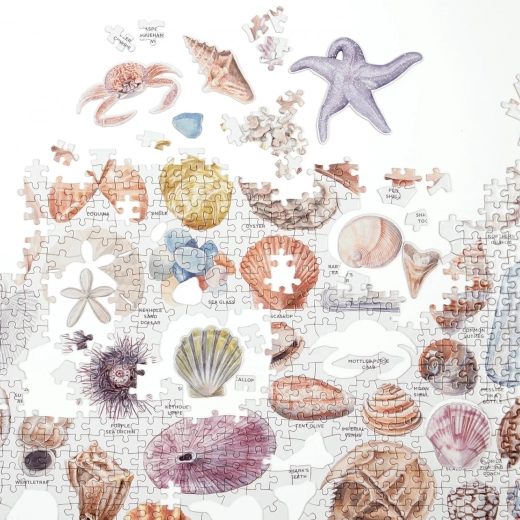 Legpuzzel met licentie op The Beachcomber’s Companion (De strandjuttersgids) van Anna Marlis Burgard, een bekende Amerikaanse reiziger en schrijfster, en tevens maker van multimediaprojecten. Toont natuurgetrouw schelpen van allerlei zeedieren en andere schatten die je tijdens wandelingen op het strand kunt tegenkomen. Sommige objecten zijn uitgevoerd als aparte puzzelstukjes met eigenzinnige vormen, wat een verfrissend element aan het leggen toevoegt. De illustraties zijn van Jillian Ditner, een wetenschappelijk illustrator vooral bekend in Noord-Amerika. Galison-puzzels worden geproduceerd met een aanzienlijk aandeel gerecycled papier en bieden eersteklas drukwerk met niet-giftige inkten. Ze hebben een matte afwerking die onder alle omstandigheden een natuurgetrouwe weergave van details en kleuren garandeert. De achterkant is bekleed met een glad oppervlak dat prettig aanvoelt en voorkomt dat er stof ontstaat wanneer de gelegde puzzel wordt bewaard. Samen met de zorgvuldig verpakte stukjes vind je in de doos ook een poster met het voorbeeld, die meestal extra informatie over de makers en de achtergrond van het werk bevat. Geleverd in een buitengewoon stevige en fraai uitgevoerde kartonnen doos van gerecycled karton en duurzaam verkregen materialen met FSC®-certificering. Belangrijkste kenmerken: 1000 nauwkeurig uitgesneden stukjes, waarvan 20 met unieke vorm; gemaakt met gerecyclede en duurzaam verkregen materialen; zorgvuldig gekozen motief van gerenommeerde makers en kunstenaars; druk en afwerking van de hoogste kwaliteit; inclusief voorbeeldposter.
