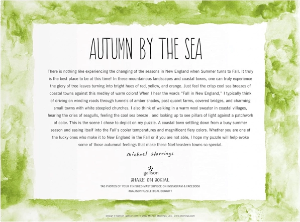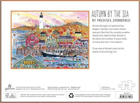Geniet van de charme van een kuststadje in de vroege herfstdagen met de artistieke puzzel Herfst aan zee van GALISON. De illustratie van Michael Storrings betovert met warme kleuren en tal van details die zorgen voor een prettige uitdaging. Hoogwaardig karton van gerecyclede materialen, een matte afwerking en veilig drukwerk bieden een premium legervaring. Het formaat van de gelegde puzzel is 69 × 51 cm, geschikt vanaf 8 jaar.