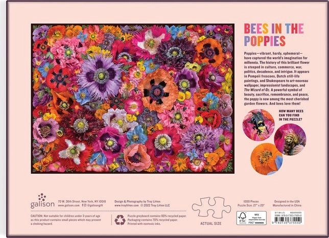 Deze premium puzzel van het merk GALISON toont een uniek beeld van de Amerikaanse reiziger en fotograaf Troy Litten: bijen tussen tientallen variëteiten klaprozen. Het hoge detailniveau en het kleurcontrast zullen iedereen bekoren die op zoek is naar een kwalitatief en esthetisch indrukwekkend motief.