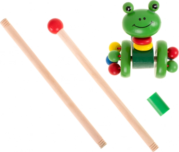 Een schattige houten kikker op wielen, die kan worden voortgeduwd met een afneembare stang, is het ideale speelgoed voor kinderen die net leren lopen. Dit speelgoed motiveert niet alleen om te wandelen, maar ontwikkelt ook hun coördinatie en balans.
