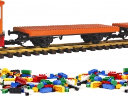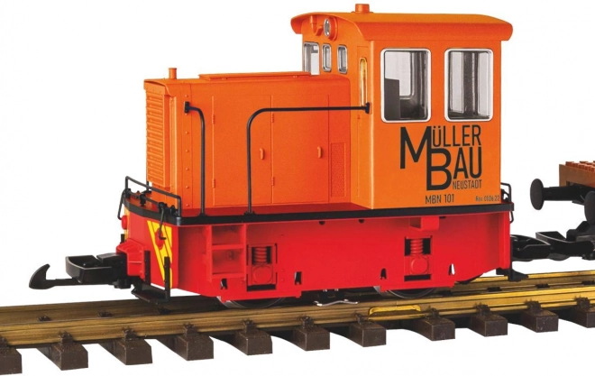 De startset bevat een basisovaal met een goederentrein, bestaande uit een GE-diesellocomotief en twee tweassige platte wagons. De locomotief wordt draadloos bediend met een handzame afstandsbediening en werkt op batterijen.