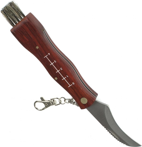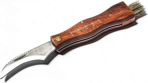 Dit veelzijdige paddenstoelenmes combineert een scherp, gebogen lemmet voor precies afsnijden met een zacht borsteltje om vuil te verwijderen. De houten handgreep ligt prettig in de hand en de geïntegreerde maatverdeling aan één zijde helpt snel de grootte van je vondst in te schatten.