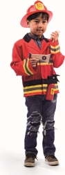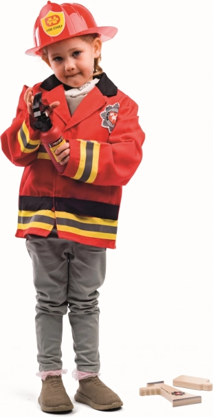 Het kinderbrandweerpak van BIGJIGS TOYS biedt alles wat kleine brandweerlieden nodig hebben voor een spannende reddingsmissie. De felrode jas met gestreepte mouwen en embleem, de verstelbare helm (49–55 cm) en accessoires zoals een houten brandblusser, walkietalkie en megafoon geven het spel een realistische dimensie.