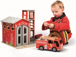 In de set zitten een houten brandblusser, een walkietalkie en een megafoon – alles voor authentieke brandweermissies en eindeloze verhalen.