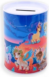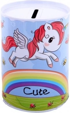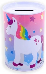 De metalen spaarpot met eenhoornmotief is niet alleen een praktische hulp bij het sparen, maar ook een prachtige decoratieve toevoeging aan de kinderkamer. De kleurrijke illustraties van eenhoorns, regenbogen en sterren zullen elk kind blij maken.