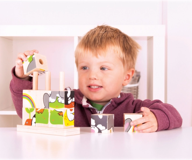 De set bevat in totaal 10 onderdelen – 9 blokjes die 4 verschillende afbeeldingen vormen, en een houten basis met pinnetjes voor veilig en overzichtelijk stapelen. Het speelgoed is gemaakt van duurzaam hout met een glad oppervlak en voldoet aan de actuele Europese veiligheidsnormen.