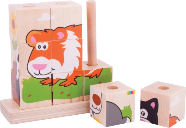 De houten stapelblokjes Bigjigs Baby zijn een uitstekende keuze voor de eerste puzzels. Kinderen oefenen hun greep, vingervaardigheid en visuele waarneming bij het zoeken naar de juiste zijden van de blokjes en het plaatsen ervan op de pinnetjes. De kleurrijke illustraties van dieren moedigen herhaald spelen aan en ondersteunen de concentratie.