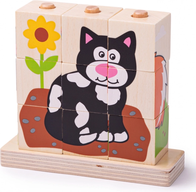Negen blokjes vormen vier verschillende dierenmotieven die uitnodigen tot herhaald puzzelen en logisch denken en visuele waarneming stimuleren.