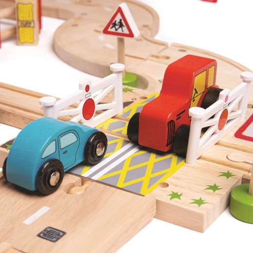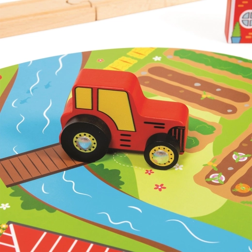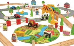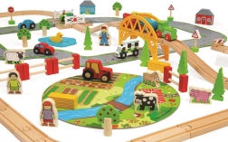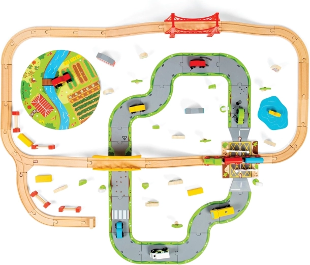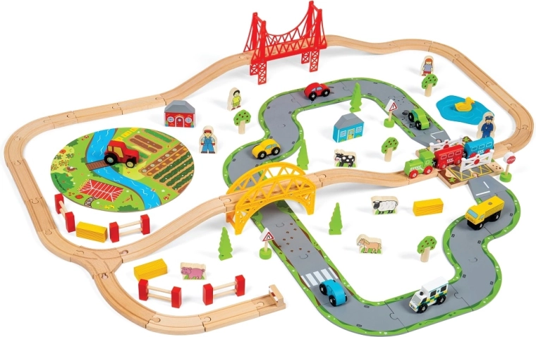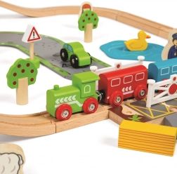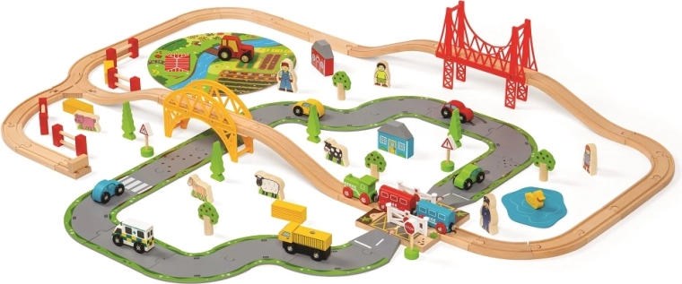 Deze houten treinbaan met landelijke weg is de perfecte combinatie van een treinbaan en autobaan, die de echte wereld van verkeer nabootst. Dankzij bruggen en overgangen worden uw kinderen meegenomen naar een wereld vol leuke avonturen. Het geheel is aangevuld met lokale accessoires zoals een boerderij, gebouwen en bomen, die de omgeving verfraaien.