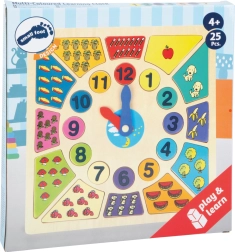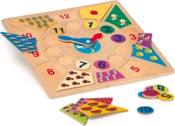De houten inlegpuzzel “Leer de tijd” is een speels leermiddel waarmee kinderen gemakkelijk leren klokkijken en hoeveelheden herkennen. Uitneembare stukjes met cijfers worden teruggeplaatst op de juiste plekken, wat concentratie en oog-handcoördinatie bevordert.