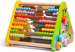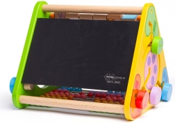 Het tekenbord, de dierfiguren en andere draai-elementen houden de aandacht vast en bieden een gevarieerd palet aan activiteiten in één stabiele driehoek.