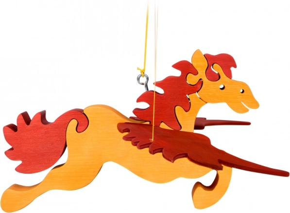 Betoverende houten decoratie voor de kinderkamer – een vliegend paard dat bij het aan het touwtje trekken begint te “klapperen met de vleugels”. Handmatig gladgeschuurd hout, veilig ontwerp en eenvoudige ophanging maken van deze hangdecoratie een charmante toevoeging boven het bedje of in de speelhoek.