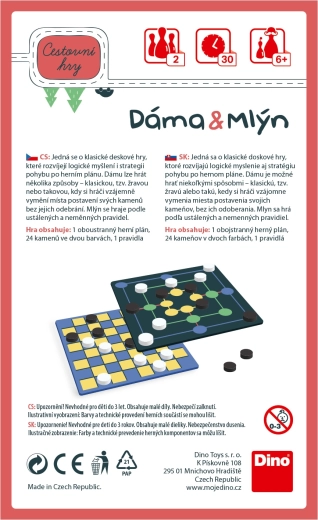 Geniet overal onderweg van klassieke strategische spellen. De compacte set van Dino biedt een dubbelzijdig speelbord voor zowel dames als molenspel, gedeelde zwarte en witte stenen en een praktische verpakking voor in de rugzak. Vermaakt kinderen én volwassenen en ontwikkelt logisch denken, tactiek en geduld. Gemaakt in Tsjechië, met het keurmerk Veilig en kwalitatief speelgoed.