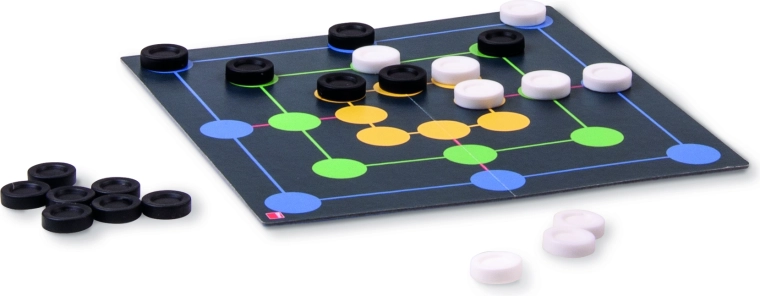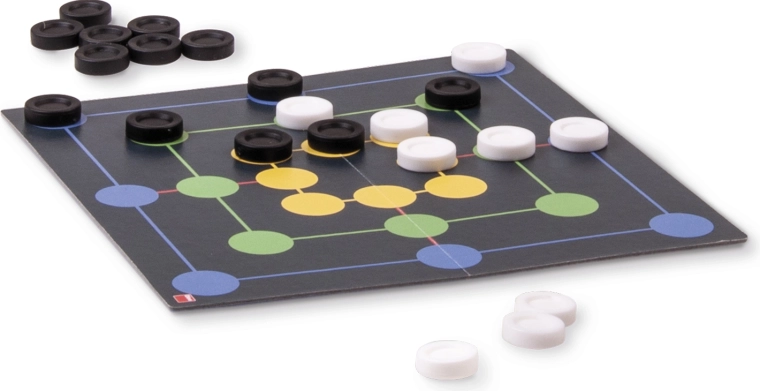 Het dubbelzijdige speelbord laat je snel wisselen tussen dames en molen. Eén set stenen is genoeg voor beide spellen, zodat je meteen kunt beginnen.