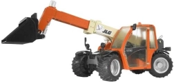 De telescopische giek wordt geheven met een zwengel aan de achterkant en kan worden uitgeschoven tot een lengte van 40 cm. De voorlaadschop is kantelbaar en eenvoudig te vervangen door BRUDER-accessoires (pallet, lier, vorken – BR2318). De cabine van onbreekbaar polycarbonaat met openende deuren en een trekhaak maken de authentieke bediening van de machine compleet.