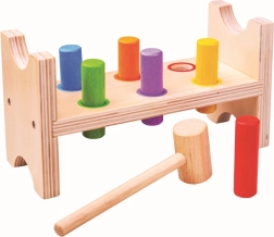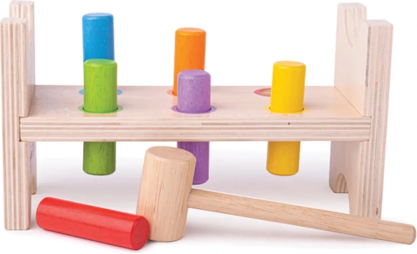 Het met de hamer inslaan van gekleurde pinnetjes versterkt de greep, precisie en oog-handcoördinatie – ideaal voor de eerste motorische uitdagingen.