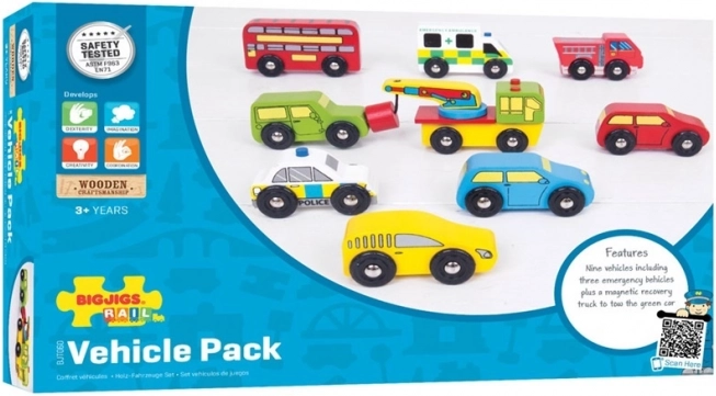 Houten autoset Bigjigs Rail is de ideale keuze voor de ontwikkeling van de verbeelding en motorische vaardigheden van je kinderen. Bevat negen kleurrijke voertuigen, waaronder een bus en een brandweerwagen.