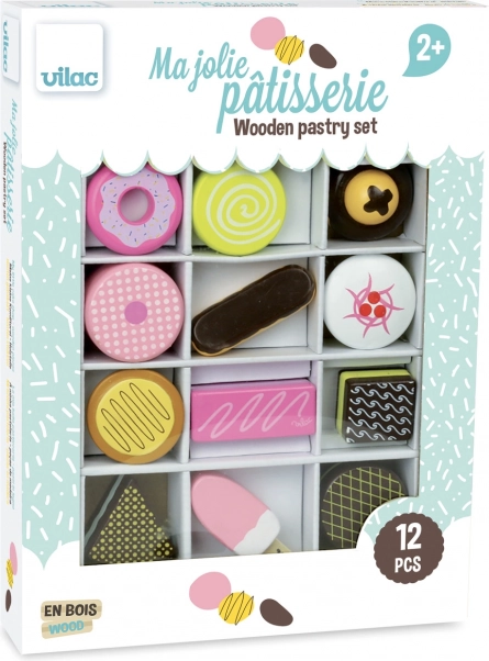 Geef kleine banketbakkers en koks plezier in het spel met de set houten zoetigheden van VILAC. De kleurrijke gebakjes en lekkernijen zien eruit als echt, passen perfect in de kinderkeuken en bij het winkeltje spelen, en stimuleren op een prettige manier zowel de verbeelding als de fijne motoriek.