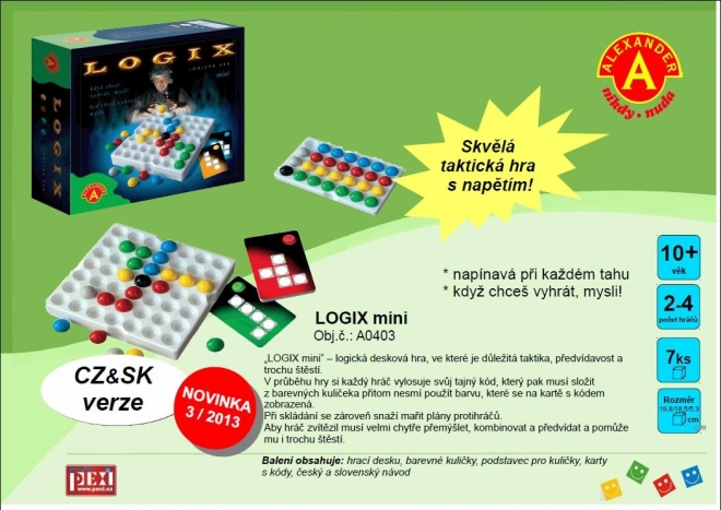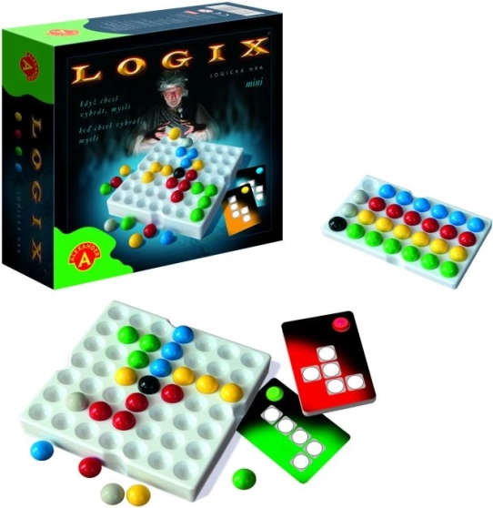 Logisch spel voor 2–4 spelers vanaf 10 jaar. Elke speler stelt met gekleurde knikkers een “geheime code” samen. Kaarten bepalen de vorm en het aantal knikkers van de geheime code. Bouw je eigen code en breek ondertussen die van je tegenstander af. Wil je winnen, denk dan goed na – de eerste complete code wint! Elke speler trekt aan het begin van het spel een kaart met de geheime code voor de plaatsing van de knikkers. Tijdens het spel proberen spelers door knikkers te leggen of te verplaatsen hun code te vormen. Het doel is om zo snel mogelijk knikkers op het speelbord te verplaatsen en toe te voegen volgens het voorbeeld (de code) op je getrokken kaart. Maak gebruik van de knikkers van je tegenstander en verstoor zijn code voordat hij die voltooit. De kleur die op je kaart staat, bepaalt de verboden kleur die je niet mag gebruiken. Leg de laatste knikker in je patroon, roep: "Meester Logix!" en je bent de winnaar. Inhoud: speelbord, gekleurde knikkers (groen, blauw, geel, rood, grijs, zwart), voorraadbak voor knikkers, kaarten met geheime codes, handleiding in het Tsjechisch en Slowaaks. Belangrijkste kenmerken: ontwikkelt logisch denken bij kinderen, geschikt voor kinderen vanaf 10 jaar. Documentatie: spelhandleiding CZ, spelhandleiding SK