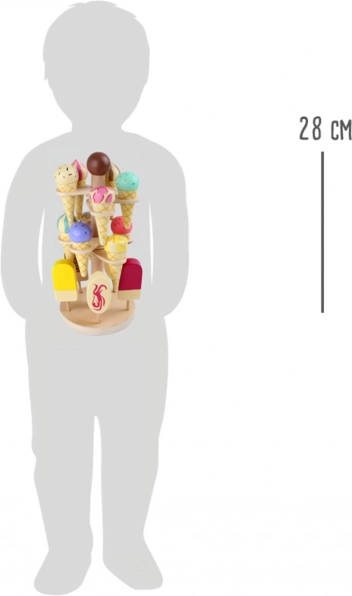 De houten ijskraam Small Foot stimuleert kinderen tot creatief spel en helpt tegelijkertijd hun cognitieve en communicatieve vaardigheden te ontwikkelen. Deze kleurrijke set heeft drie niveaus met tien ijsjes en vijf waterijsjes, die in ronde openingen kunnen worden geplaatst of in de voet van de standaard kunnen worden gezet.
