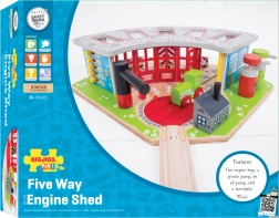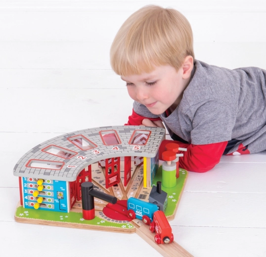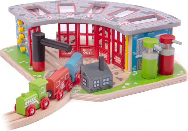 Het houten depot is ontworpen voor vijf verschillende treinen en bevat een functionerende draaischijf, die zorgt voor gemakkelijke verplaatsing van de treinen tussen verschillende garages. Het systeem bevat openende deuren en een pompstation, wat bijdraagt aan een realistische speelervaring.
