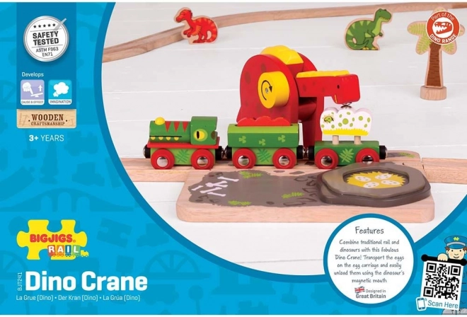 De dinosauruskraan van Bigjigs Rail brengt een vleugje avontuur naar je houten treinbaan. Kinderen verplaatsen met de bewegende nek van de dinosaurus en de magneet het dinosaurus-ei naar het meegeleverde wagentje en trainen zo hun oog-handcoördinatie. Het kleurrijke design en de stevige houten constructie nodigen uit tot fantasierijk spel dat lang meegaat.