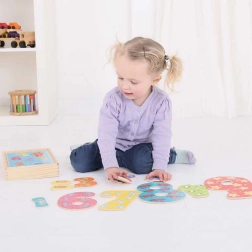 Tip voor ouders: Laat het kind eerst de afbeeldingen op de stukjes tellen en zoek daarna samen het juiste cijfer. Voeg geleidelijk hogere cijfers toe, zodat plezier en leren meegroeien met de vaardigheden van het kind.