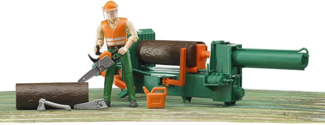 De set bevat een arbeidersfiguur met vest en helm met vizier, een houtkloofmachine, 2 houtblokken en een complete gereedschapsset – bijl, handzaag, kettingzaag en benzinekan. Zo kunnen kinderen fijne motoriek en fantasie trainen tijdens veilig en creatief spel.