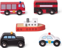 Breid je stad langs het spoor uit met een bonte vijf van iconische voertuigen. Dankzij het robuuste hout, de gladde randen en de gemakkelijke grip zijn de speelgoedvoertuigen ideaal voor kleine kinderhanden. Elk voertuig heeft vrij draaiende wielen (de boot met beschilderde romp) en is klaar voor intensief dagelijks spel.