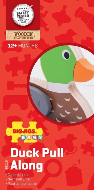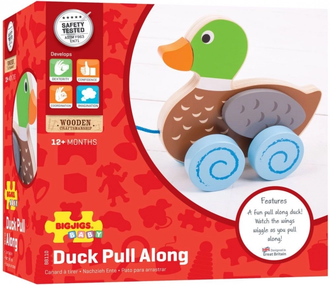 Bij het trekken waggelt de eend grappig en bewegen de vleugels. Gekleurde wielen met een spiraalpatroon trekken de aandacht van kinderen en moedigen hen aan tot nieuwe stapjes.