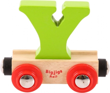 Maak je eigen naamtrein met de wagon met de letter Y van BIGJIGS RAIL. Stevige houten uitvoering, magnetische koppelingen en een afneembare letter voor spelenderwijs leren van het alfabet en het ontwikkelen van fijne motoriek.