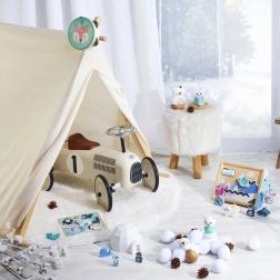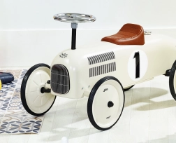 Dankzij de rubberbanden rijdt hij stil, zelfs op harde ondergronden, waardoor de loopauto geschikt is voor zowel binnen als de stoep. Het retrodesign komt tot zijn recht in elke kinderkamer en stimuleert de fantasie en het plezier in bewegen.
