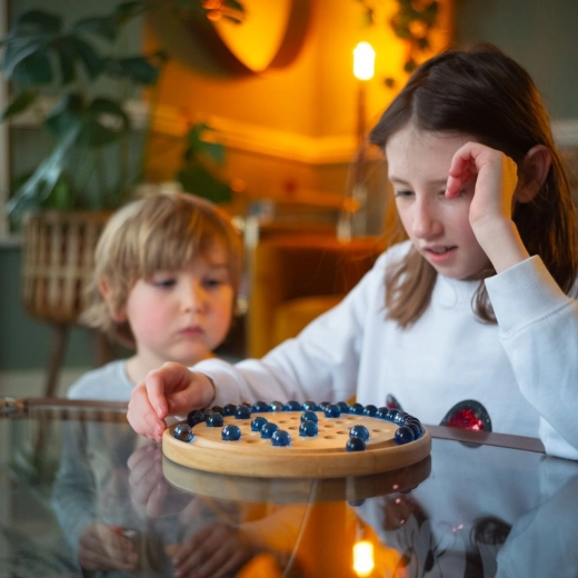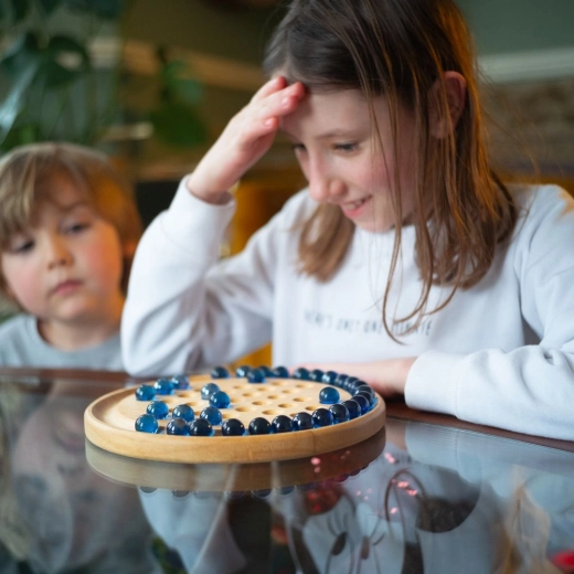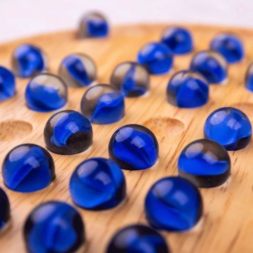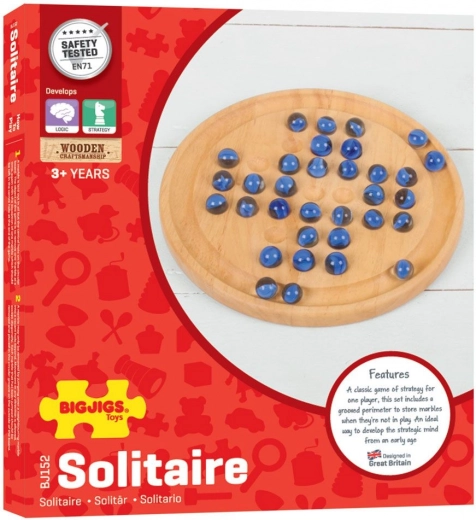 Ontdek tijdloos plezier met de houten solitaire van BIGJIGS TOYS. Glanzende blauwe knikkers en een zorgvuldig afgewerkte ronde plaat creëren een elegant logisch spel dat zowel je vindingrijkheid als geduld test. Het doel is om door te springen met de knikkers er telkens één te verwijderen, zodat er uiteindelijk één knikker overblijft.