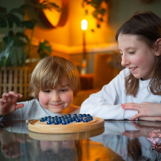 De ronde plaat van glad hout en glanzende glazen knikkers zorgen voor een prettig spelgevoel en lange levensduur.