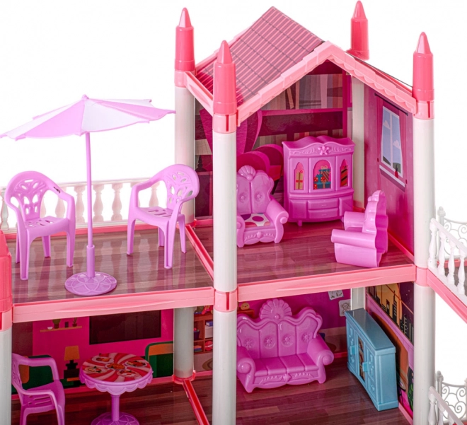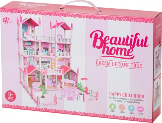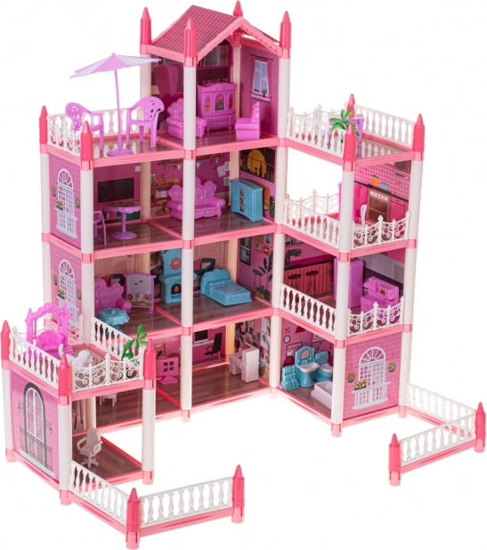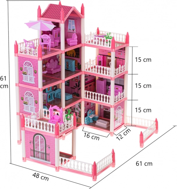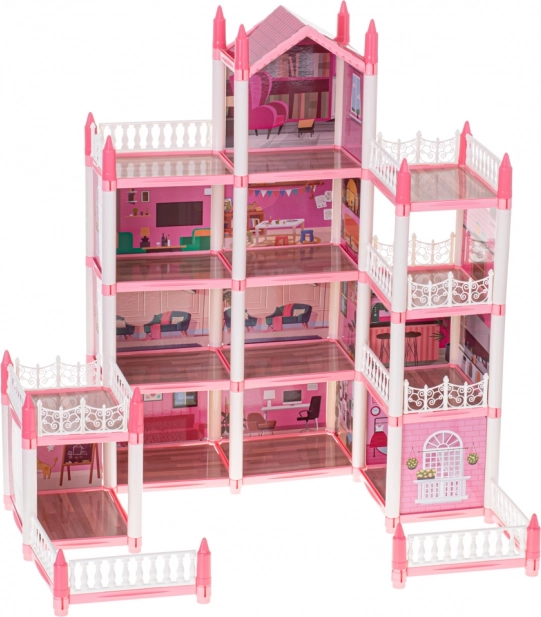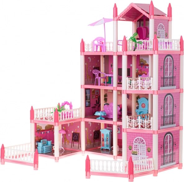 De roze villa voor poppen heeft vier verdiepingen met boeiende en gevarieerde kamers om te ontdekken.