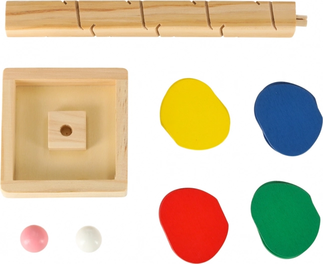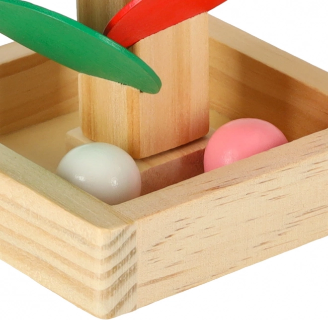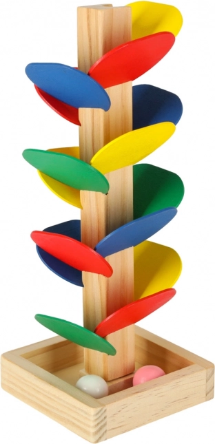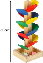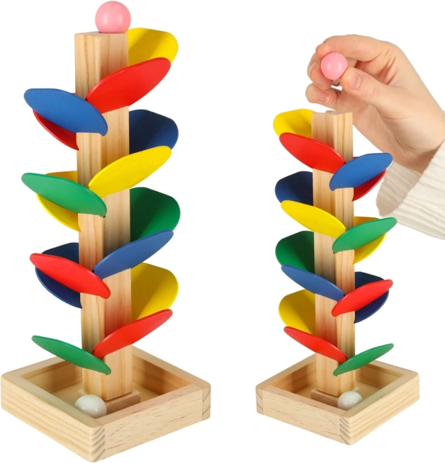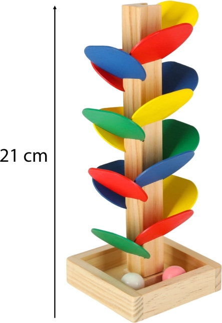 Gekleurde blaadjes en zachte geluiden bij de landing van de knikkers houden de aandacht van kinderen vast, ondersteunen concentratie en kleurwaarneming.