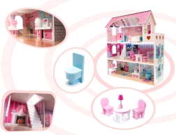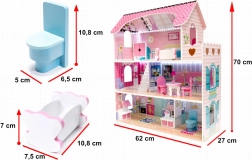 Groot houten poppenhuis van 70 cm hoog van MDF met drie verdiepingen, vijf kamers en een terras, een uitgebreide set meubels en sfeervolle LED-verlichting. Dankzij openende kastjes, zorgvuldige afwerking en veilig afgeronde elementen is het de ideale speelgoedkeuze voor creatief en fantasiespel en tevens een mooie decoratie voor de kinderkamer.