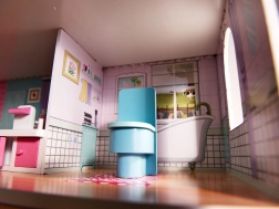 Het huis biedt drie niveaus met vijf kamers, trappen en balkonnetjes. Kleurrijke prints op muren en vloeren creëren een gezellige sfeer voor fantasierijk spel.