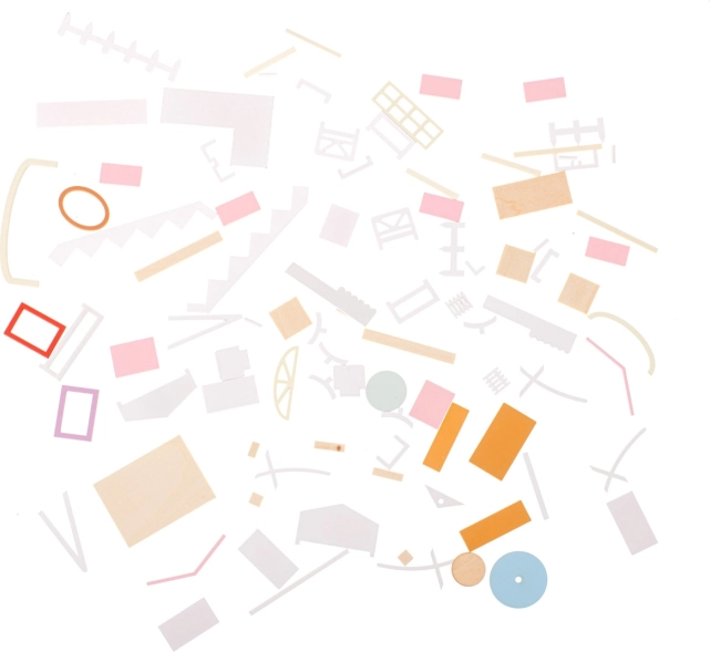 Kleurige kleine elementen en accessoires stimuleren de fantasie en de ontwikkeling van de fijne motoriek bij het inrichten van het interieur van het huisje.