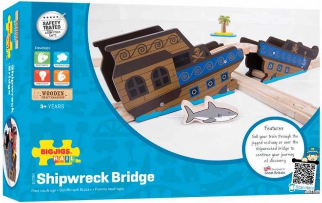 De Bigjigs Rail scheepswrak-brug voegt een avontuurlijke sfeer toe aan jouw treinwereld. De twee stevige delen bouw je eenvoudig als indrukwekkende overbrugging of doorgang, zodat treinen zowel over als door het gedecoreerde wrak kunnen rijden. Het piratenthema en de zeegolven prikkelen creatieve verhalen en zorgen voor uren speelplezier.