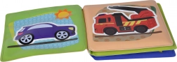 Vrolijke illustraties van auto’s, boten, een onderzeeër en een vliegtuig stimuleren de woordenschat en het visuele waarnemingsvermogen.