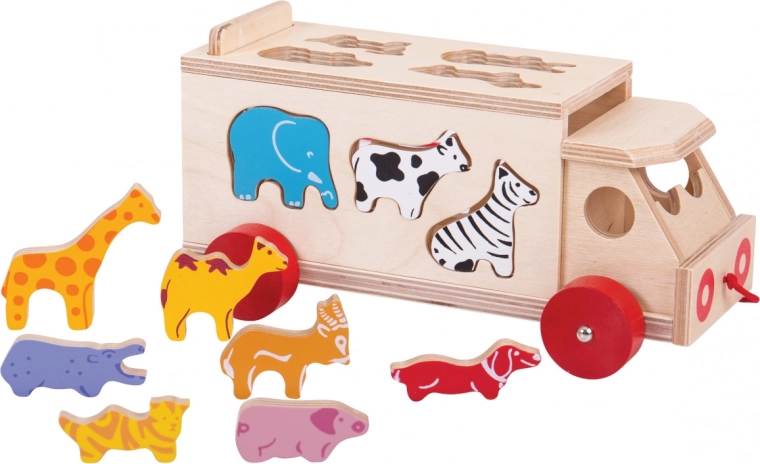 Deze hoogwaardige houten trekauto met dieren combineert een klassieke vormenstoof met bewegend spel. Kinderen kunnen de dieren door de bijpassende openingen duwen, de achterdeurtjes openen en op pad gaan door aan het koord te trekken. Het spel stimuleert op natuurlijke wijze de ontwikkeling van vaardigheid, geduld en kennismaking met kleuren en vormen.
