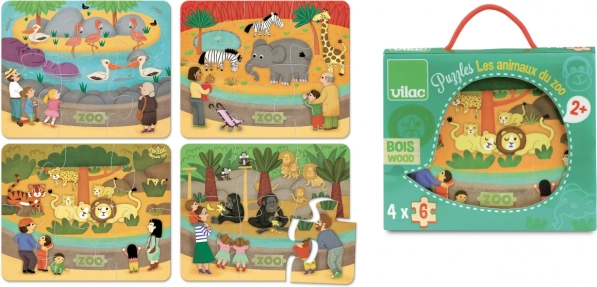 Houten puzzels met ZOO-thema bieden plezier voor kinderen vanaf 2 jaar. Bevat vier puzzels, elk met zes stukjes, praktisch opgeborgen in een houten doos met katoenen handvat.