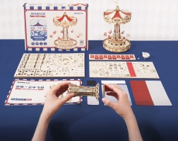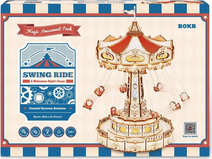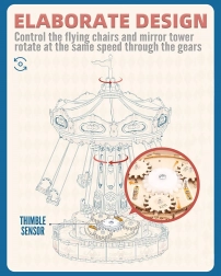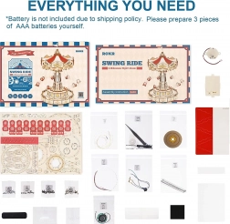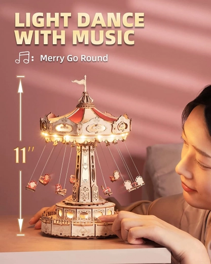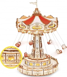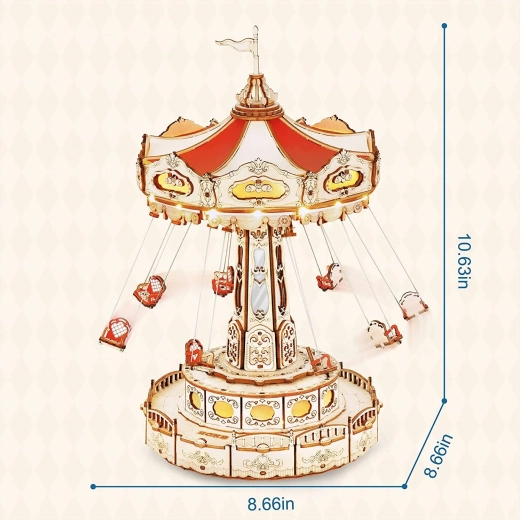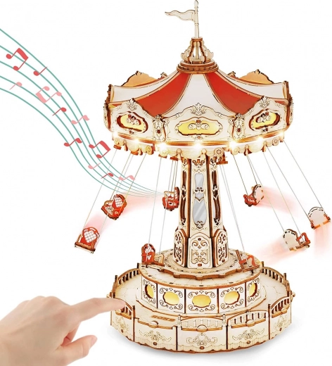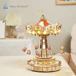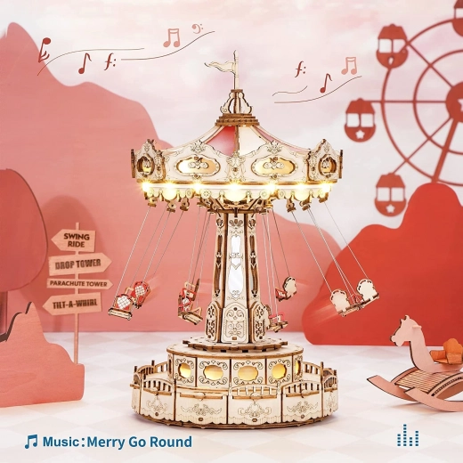 Deze 3D puzzeldoos muziekdoos toont een elegante kettingcarrousel met rijke versieringen in natuurlijke en kleuraccenten. Na montage draait de carrousel dankzij de motor, gaat het LED-licht aan en klinkt de melodie Merry Go Round, die een nostalgische, romantische sfeer oproept. De set wordt ongevouwen geleverd met een gedetailleerde handleiding – ideaal voor een creatief weekendproject.