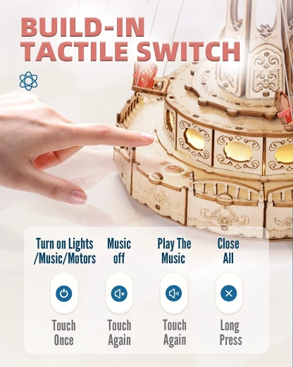 Met de touchbediening kun je beweging en muziek afzonderlijk regelen, zodat je de beleving aan je stemming aanpast. Het gemiddelde moeilijkheidsniveau, ongeveer 6 uur bouwtijd en 289 onderdelen van hoogwaardig hout en metaal maken dit model tot een geweldig cadeau voor creatieve tieners en volwassenen. Na voltooiing wordt het een stijlvolle decoratie voor een plank, werkkamer of woonkamer.
