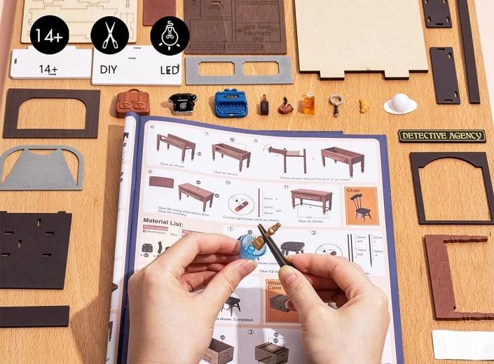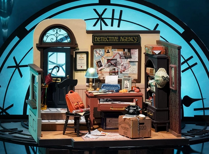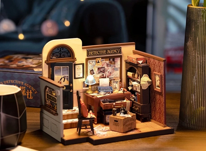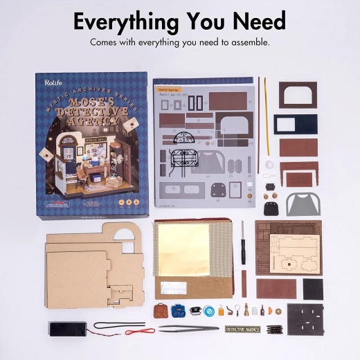 Maak je eigen miniatuur van een detectiveskantoor in Britse stijl uit de serie ROBOTIME ROLIFE Mystic Archives. Deze gedetailleerde DIY-set biedt LED-verlichting, tal van realistische accessoires en een eenvoudigere montage dankzij een groter aandeel kant-en-klare onderdelen. Ideaal als cadeau, creatieve ontspanning en stijlvolle decoratie voor je interieur.