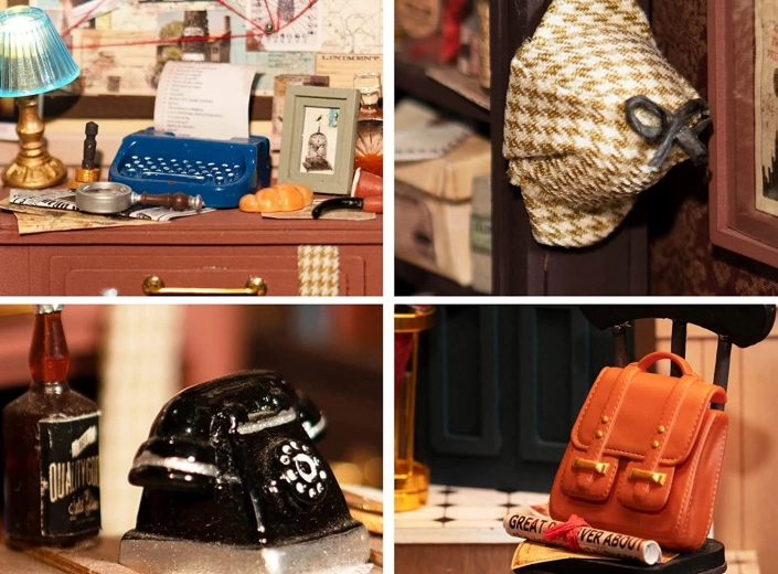 Typemachine, prikbord met aanwijzingen, telefoon en hoed – elk miniatuuritem creëert de sfeer van een Brits detectivebureau.