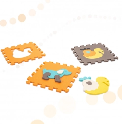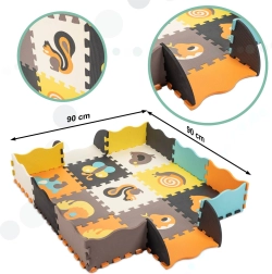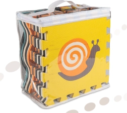 Deze grote schuimrubberen mat bestaat uit 25 onderdelen (9 hoofddelen met uitneembare dieren en 16 randstukken). Dankzij de grovere oppervlaktestructuur en contrasterende kleuren stimuleert hij op natuurlijke wijze zicht en tast. Het zachte EVA-schuim dempt vallen bij de eerste stapjes en beschermt tegen kou van de vloer.